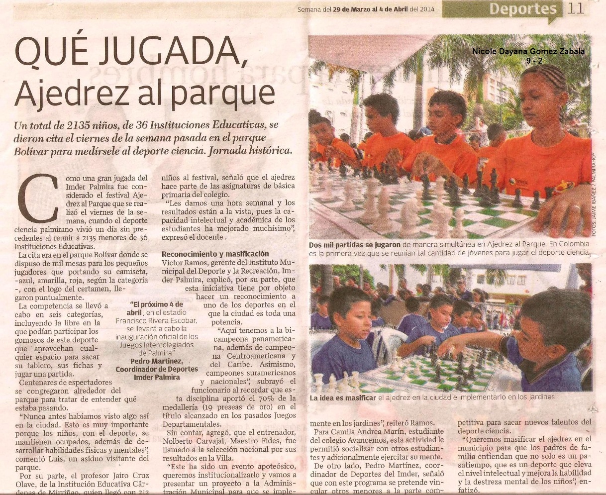 AJEDREZ AL PARQUE La estudiante Nicole Dayana Gomez Zabala del grupo 9- 2, concursando en Ajedrez al parque en Palmira, MARZO 21- DEL 2014. NUESTRAS SINCERAS FELICITACIONES PARA ELLA, PARA EL GRADO 9-2 Y PARA LA FAMILIA GOMEZ ZABALA